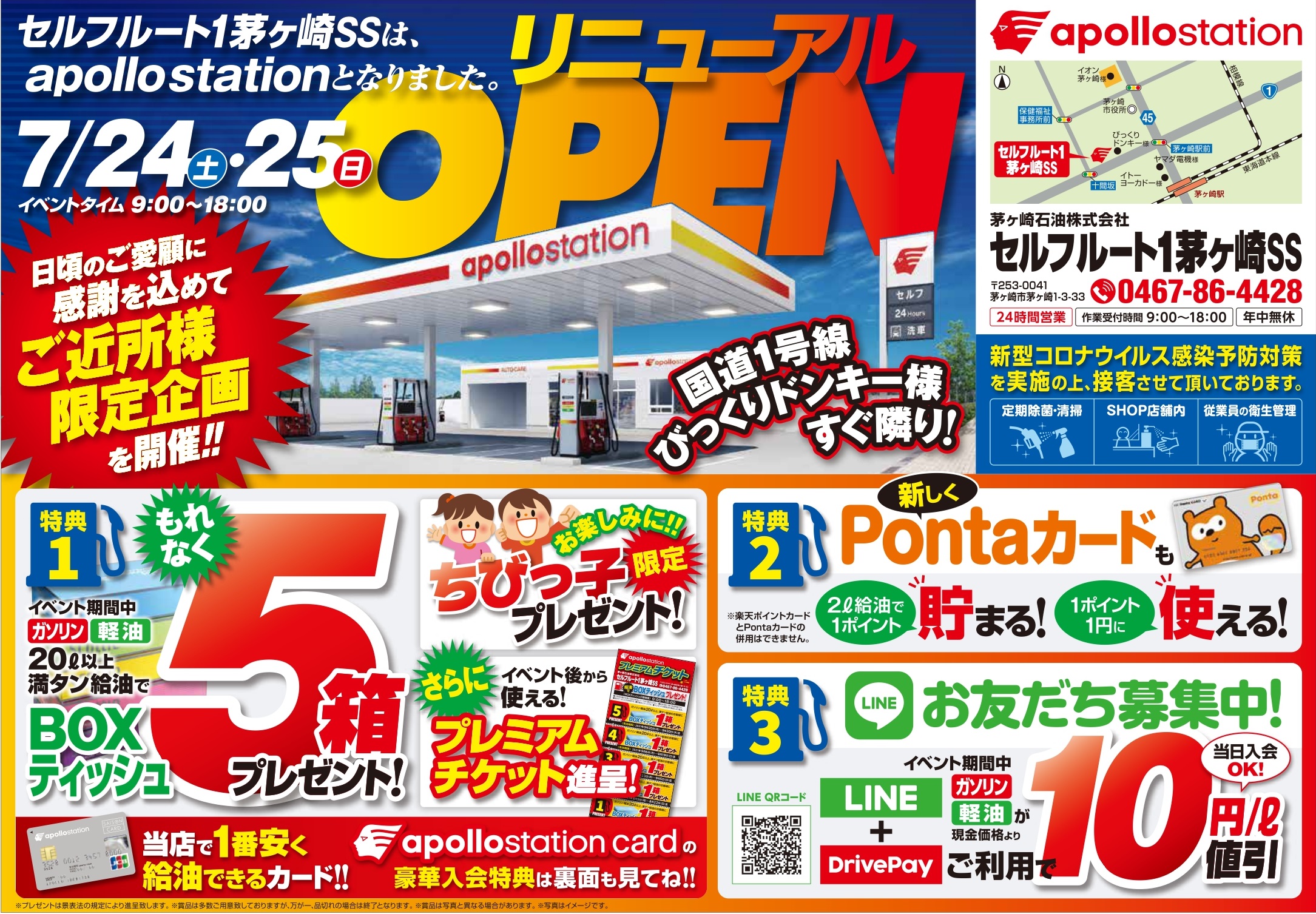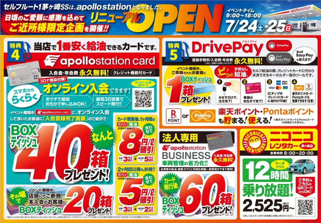 日時:7月24日(土)、7月25日(日) 9時~18時 場所:セルフルート1茅ヶ崎SS(国道一号線沿い、びっくりドンキーさんの横) 内容:①イベント期間中ガソリン・軽油20ℓ以上満タン給油でBOXティッシュ5箱プレゼント! ②apollostationカードにご入会 オンライン入会でBOXティッシュ40箱プレゼント! イベント期間中店頭入会でBOXティッシュ20箱プレゼント! ③イベント期間中、LINE友達追加+DrivePayご利用で、ガソリン・軽油が 現金表示価格より10円/ℓお安くなる! ④小さいお子さんにはお菓子のプレゼントも! などなど・・・